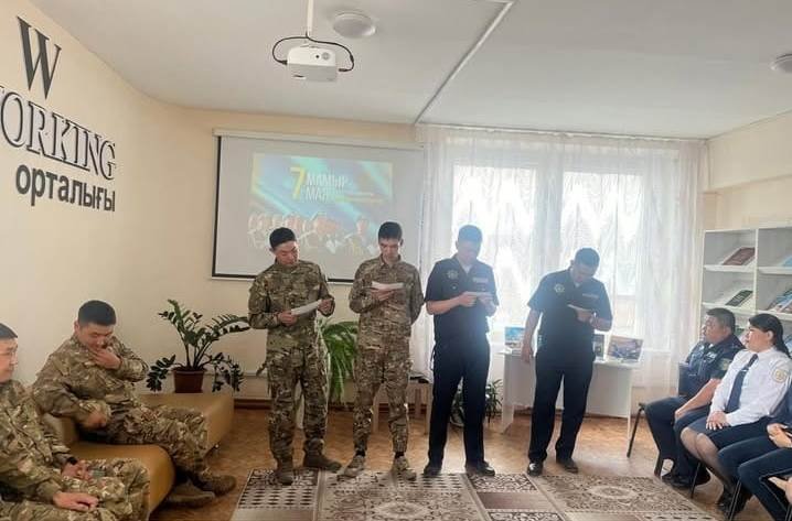 7 мамыр - Отан қорғаушылар күніне орай модельдік орталық аудандық кітапханасында «Нағыз ер азаматтар Отанға қызмет етеді» тақырыбында патриоттық сағат өткізілді. Іс-шара патриоттық бейнеролик көрсетумен басталды, онда Қазақстан Республикасының Қарулы Күштерінің тарихы мен қазіргі жетістіктері баяндалды. Шара жүргізушілері қатысушыларды Отан қорғаушылар күнімен құттықтап, бұл күннің маңыздылығын және шығу тарихын баяндады. Қатысушыларға төтенше жағдайдағы әрекеттерді бейнелейтін көрініс ұсынылды. Бұл бөлімде оларға нақты өмірлік жағдайлар ұсынылып және шешім қабылдау қабілеттері сыналды. Қатысушыларға әскери қызмет, патриотизм және азаматтық борыш туралы сұрақтар қойылып, олар өз пікірлерін білдірді. Іс-шара барысында патриоттық ән орындалып, көрермендерге рухани әсер сыйлады.
